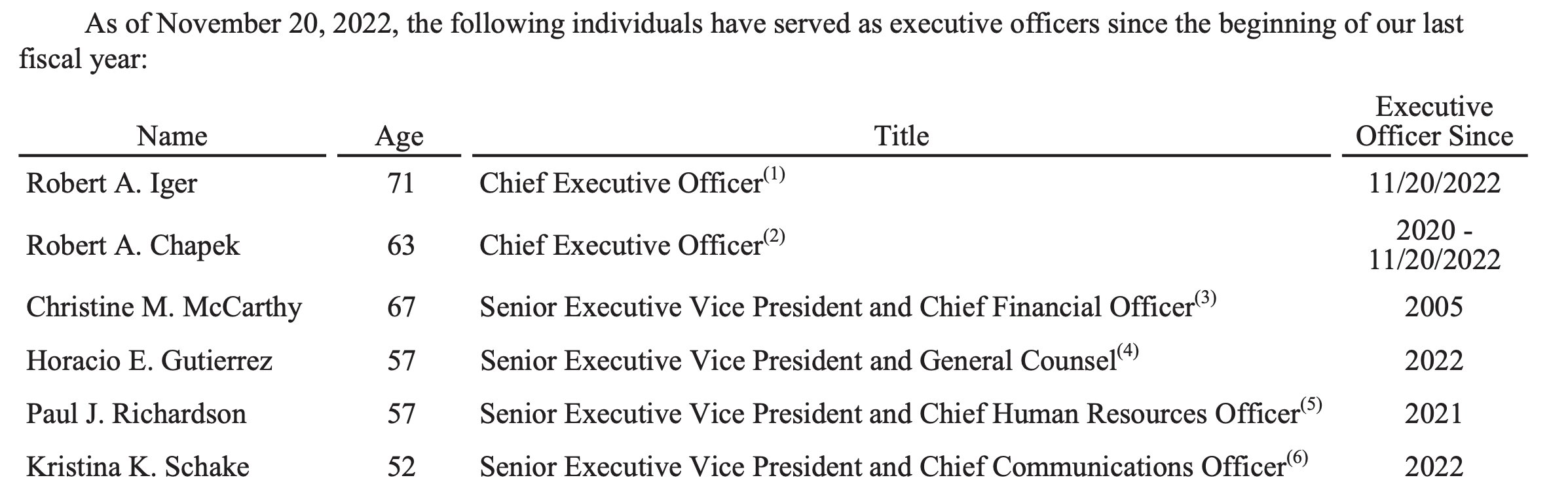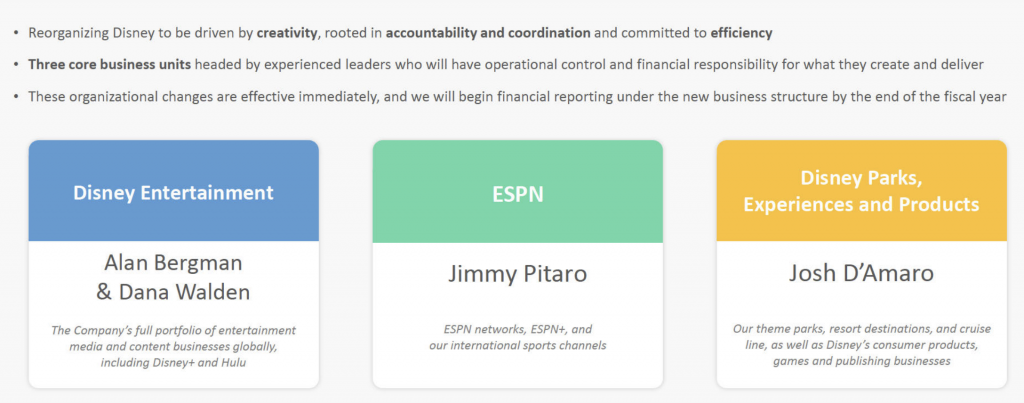 Con el nuevo CEO, Bob Iger, ha habido cambios de reestructuración con efecto inmediato desde su incorporación a la empresa, si bien el mismo ha manifestado que estos cambios empezarán a reflejarse en el 10k de 2023. La estructura queda como sigue: