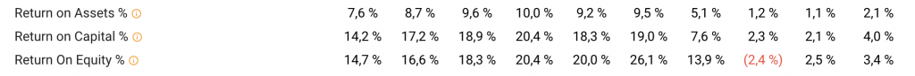 El ROA (Net Income/ Total Assets) ha sido bueno y estable hasta 2018, rondando una media del 10%. Actualmente se situa en el 2%