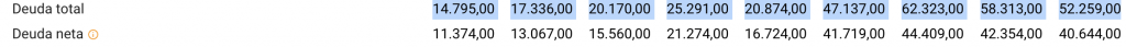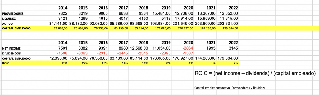 Como se puede observar, durante los últimos años el ROIC es muy bajo, se deduce que ahora mismo la empresa no obtiene rentabilidad sobre el capital que invierte