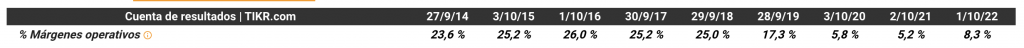 Los márgenes operativos (márgenes ebit) de la compañía se han visto reducidos desde 2020, si bien este último año 2022 ha habido un ligero crecimiento