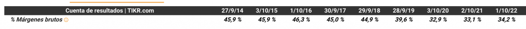 Los márgenes brutos altos (+40%) a largo plazo son indicativos de una compañía con ventajas competitivas (warrent buffet)