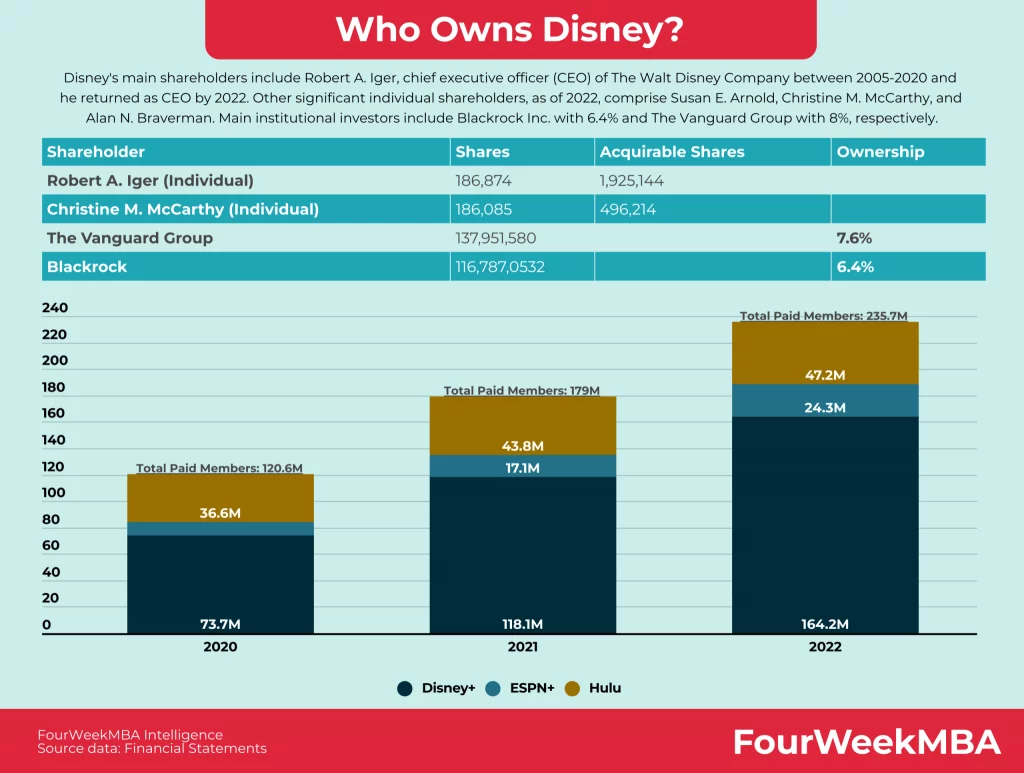 4. Propiedades intelectuales: Disney posee una extensa cartera de propiedades intelectuales, que incluyen personajes icónicos como Mickey Mouse, Donald Duck, y Goofy, así como franquicias exitosas como Star Wars, Marvel, Toy Story, Frozen y más.